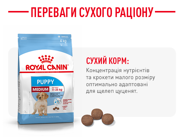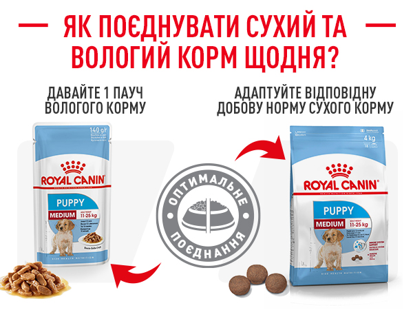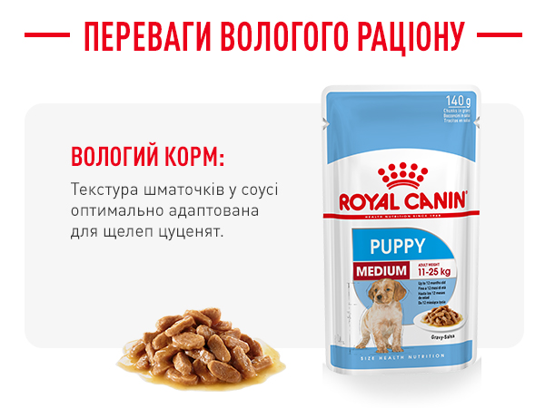 Вологий раціон ROYAL CANIN Puppy Medium розроблений для цуценят собак середніх розмірів, вага яких у дорослому віці від 11 до 25 кг. Цуценята від 2 до 12 місяців.