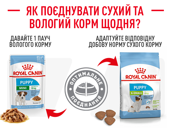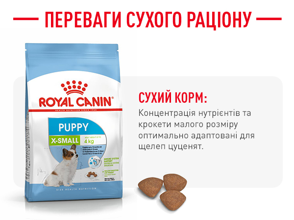 Раціон ROYAL CANIN Puppy X-Small розроблений для цуценят собак мініатюрних розмірів, вага яких у дорослому віці до 4 кг. Цуценята до 10 місяців.